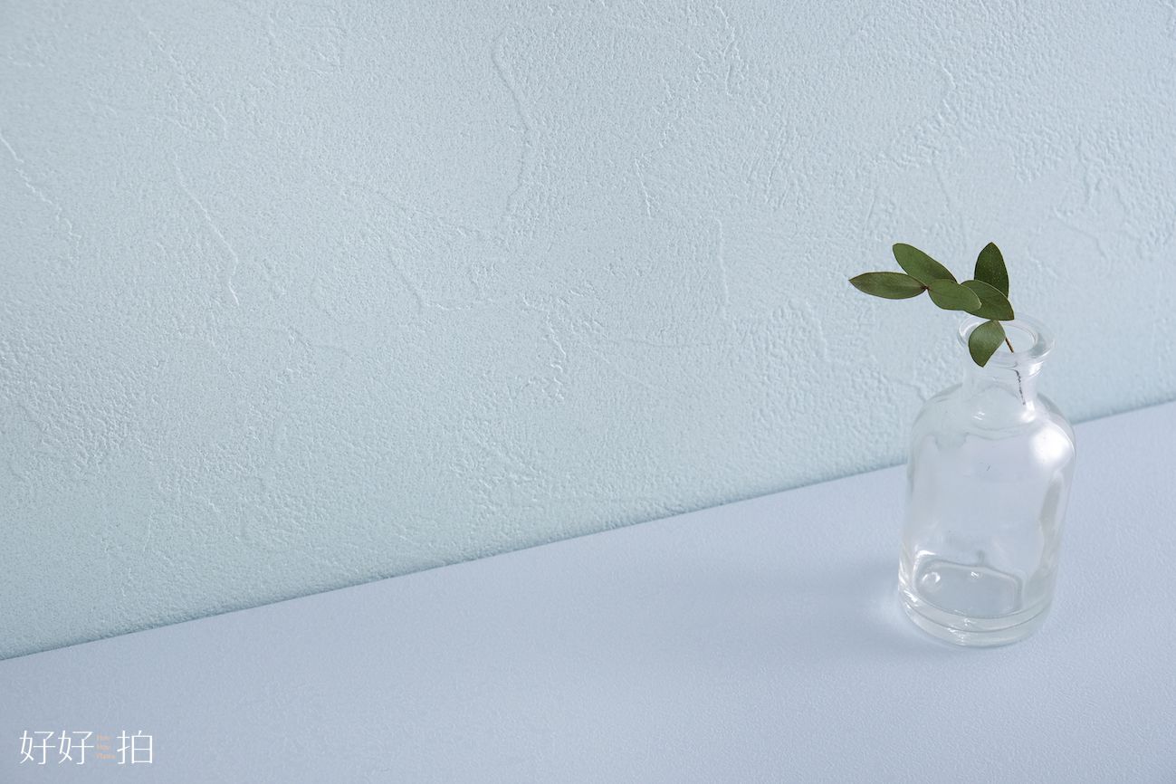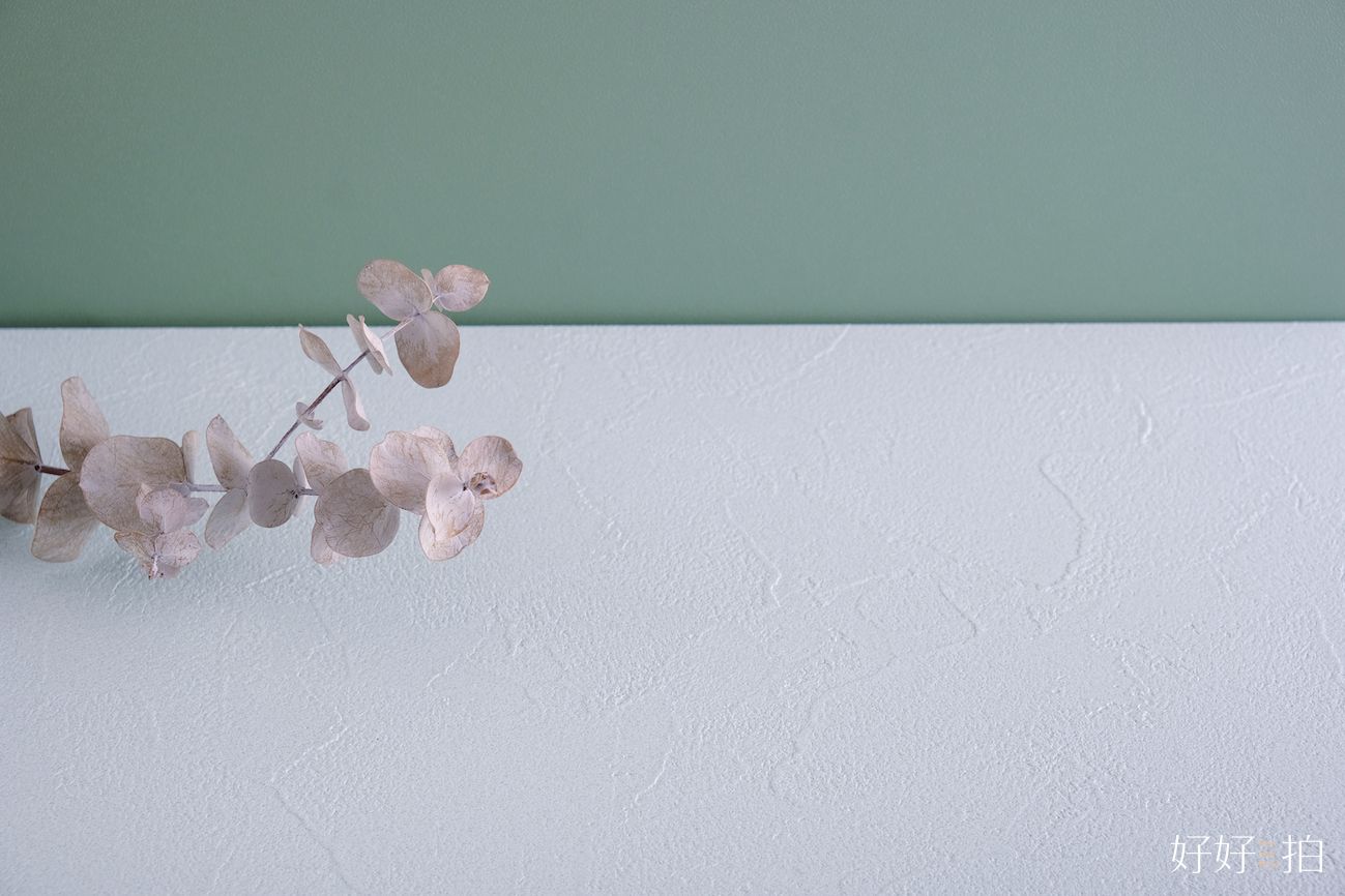 下圖牆面為輕青、與純白色的桌面背景板示意對照圖