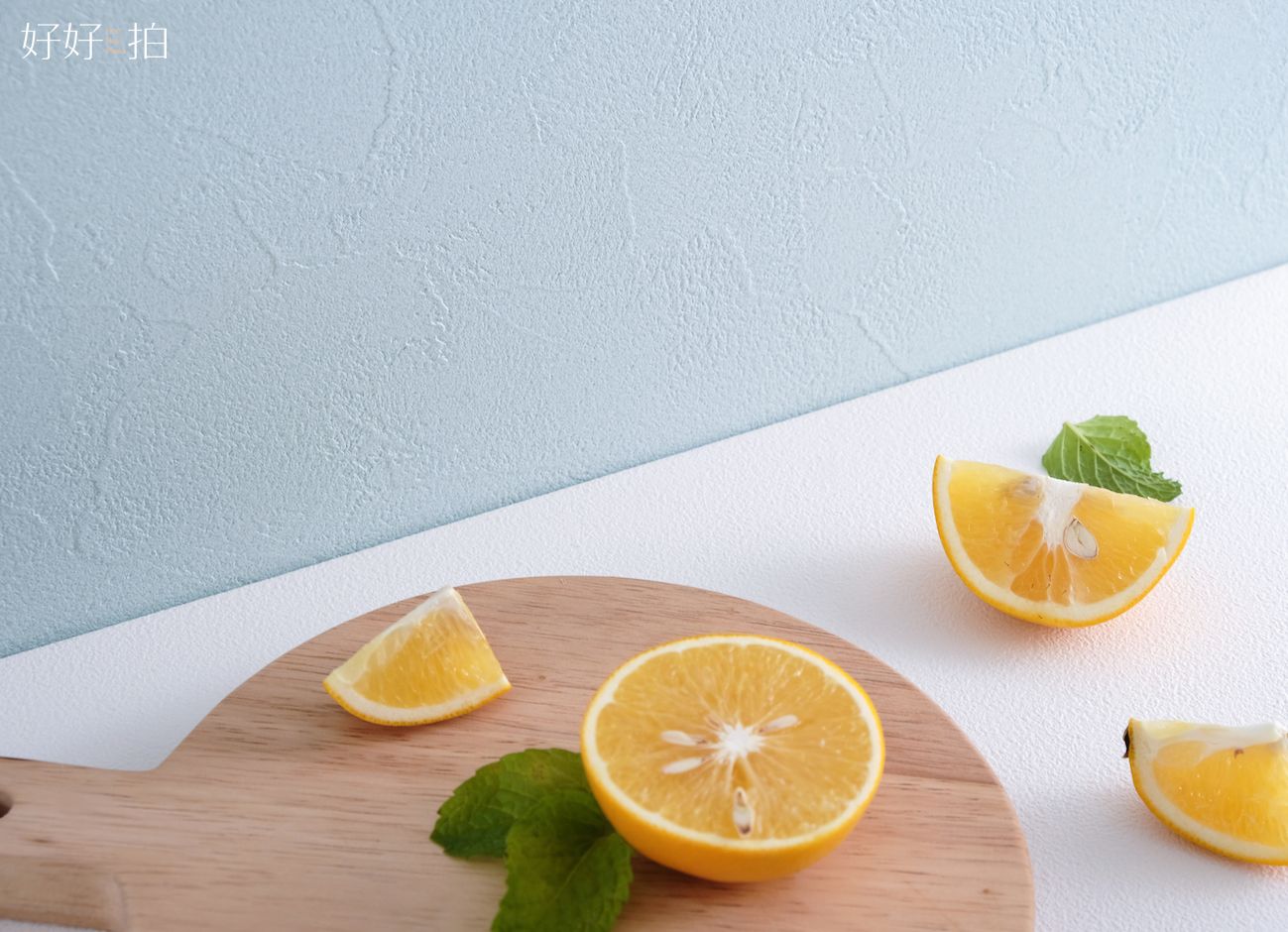 下圖牆面為輕青、與淡藍色的桌面背景板示意對照圖